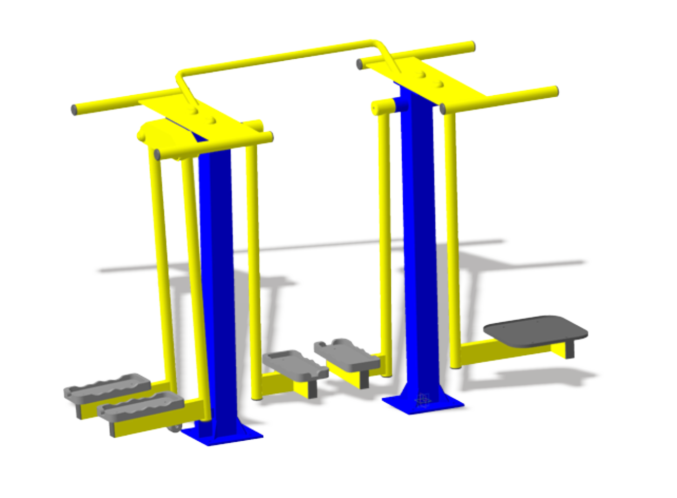 Несущая конструкция – профильная труба 100х100 толщина стенки 4мм. прямоугольного сечения 80х40х3мм. Все узлы вращения оснащены подшипниками закрытого типа, что позволяет использовать оборудование в любых погодных условиях. Тренажер покрашен с применением полимерной порошковой покраски. Конструкция имеет радиальные загибы (округление), выполненные для безопасности и увеличения прочности конструкции. Конструкция тренажера обеспечивает антивандальную защиту и безопасность при занятиях.